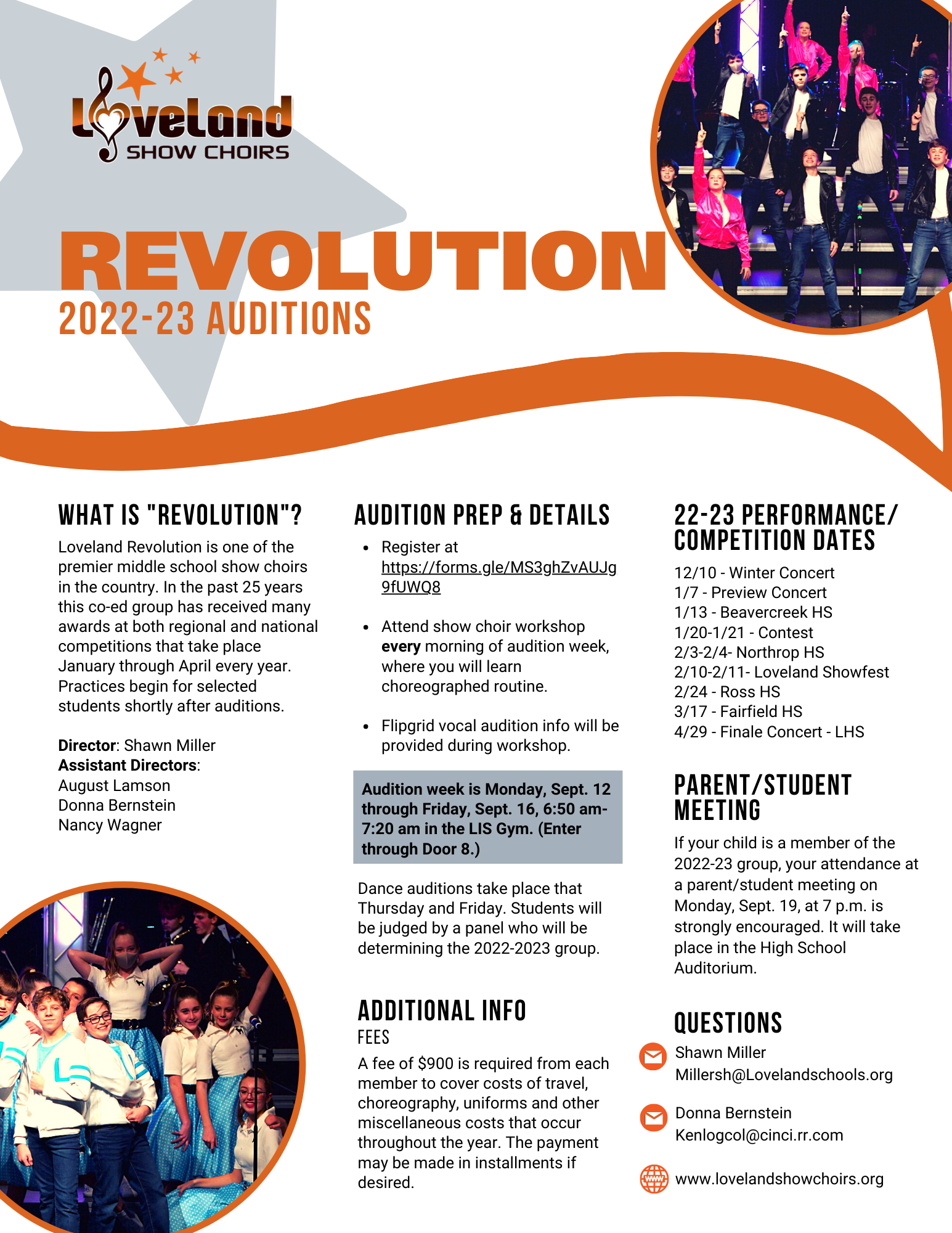 Loveland Show Choirs has opened registration to audition for the 2022-23 Revolution (middle school) group. Go to https://forms.gle/MS3ghZvAUJg9fUWQ8 to register.