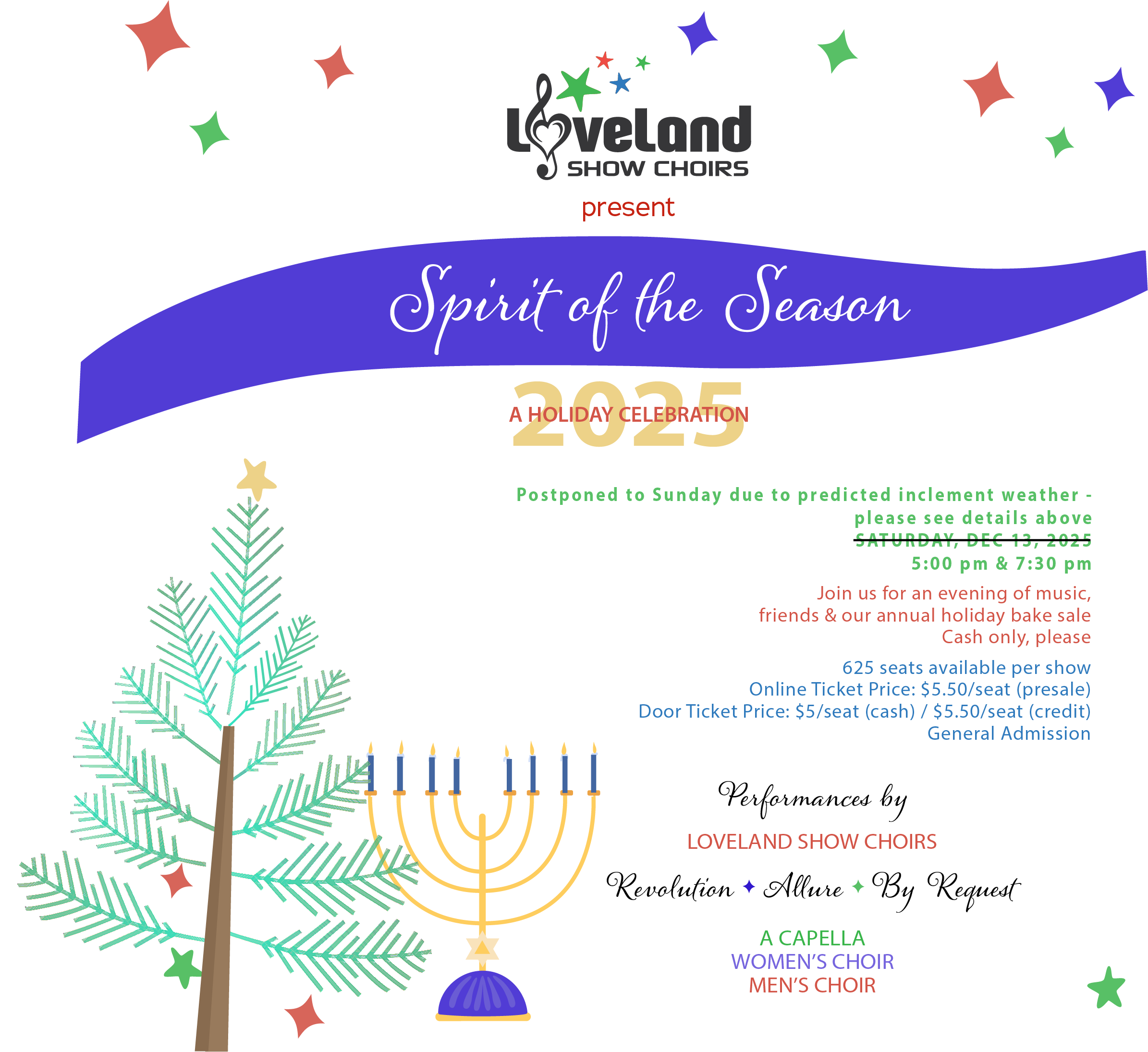 Due to predicted inclement weather, Spirit of the Season 2025 has been postponed to Sunday, Dec. 14, at the same times (5 pm and 7:30 pm). For those who have already purchased tickets, those tickets are still valid. (You were sent an email regarding notice of postponement.) Online ticket sales (link below) have been extended until 6 pm on Saturday, Dec. 13, and limited tickets will be available at the door. Get into the holiday spirit by seeing these wonderful groups perform!